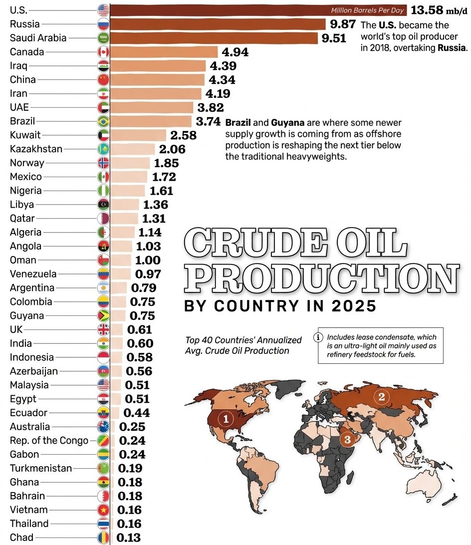 - The U.S. was the world’s largest crude oil producer in 2025, pumping 13.58 million barrels per day.